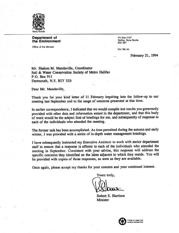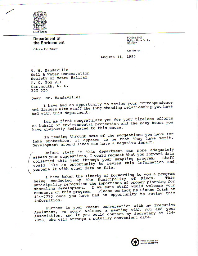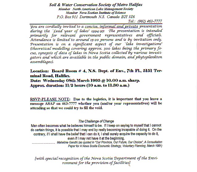 .............. with salutations to our primary founding partner in 1989, the Nova Scotia Environment Department; Formal inaugural invitation d/December 20, 1989 on the suggestion of their limnologist. Dr. John Underwood PhD ...............