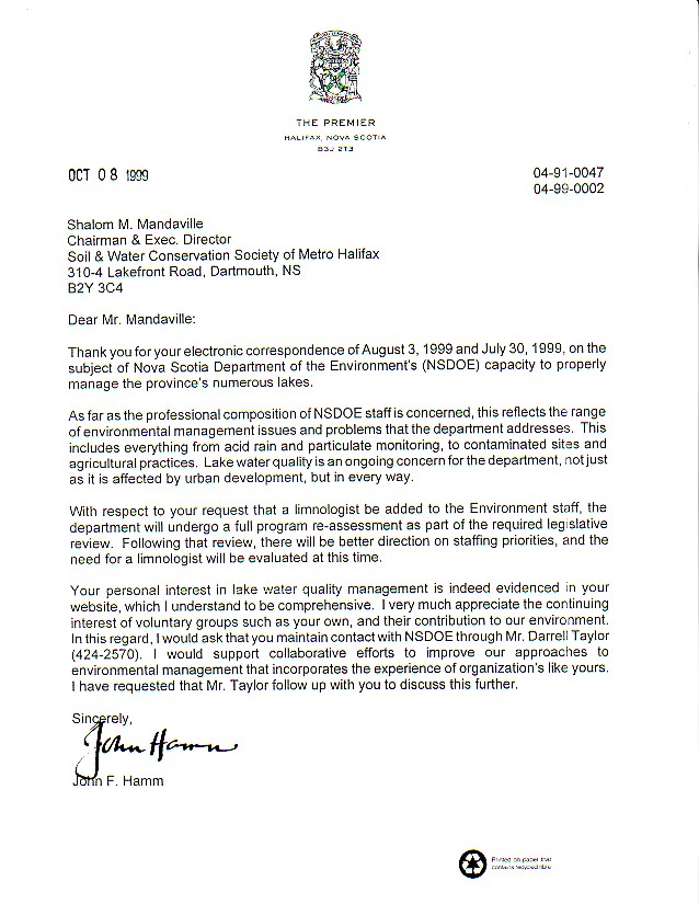 - Select dealings with Darrell Taylor, Water Quality Analyst, pursuant to a policy communique' from Premier John Hamm MD; October 08, 1999