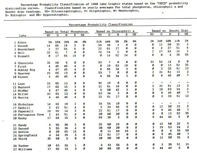 For this reason, prediction uncertainties must be accounted for. This can be achieved by reinterpreting the summary values listed in Table-3 in terms of classification probabilities. The resulting probability distribution is given in Figures 3 to 6 for the main components: average lake phosphorus, average and peak chlorophyll concentrations and average yearly Secchi disk transparency.
