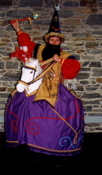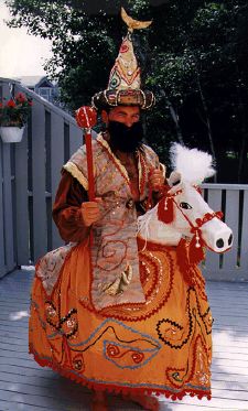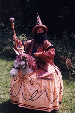 who'rides him has a coat of similar material tied in front with a red sash and yellow trousers. His conical hat is peaked with a crescent and he twirls a mace in his hand. The Lajkonik always sports a thick, dark