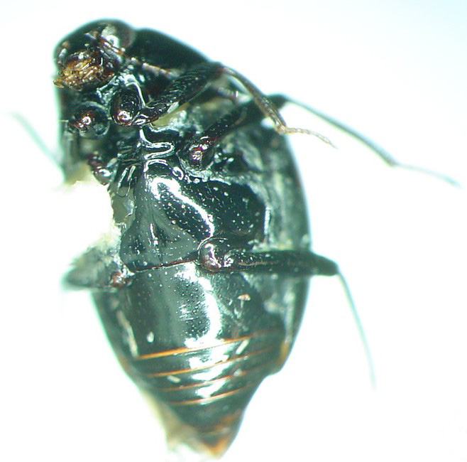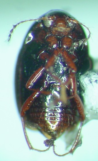 Length 1.7-2.2 mm; Pronotal & abdominal microsculpture usually invisible at 90x magnification; antenomere 3 distinctly shorter than 2 or 4. Black brown to black with apical portion of elytra paler. - Baeocera congenera Casey