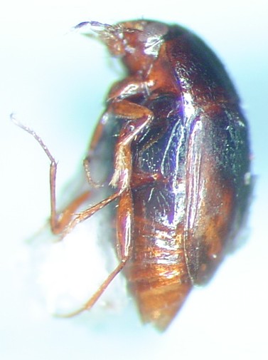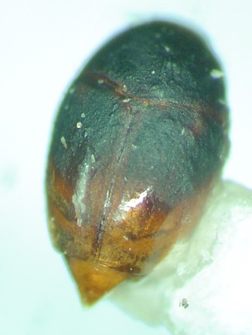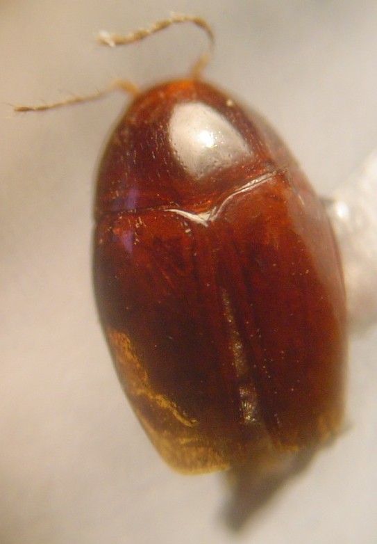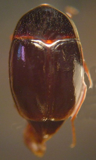 Small species: 1.15-1.2 mm. Dark brown to black; apex of elytron paler. Antennomere 2 shorter than 3 & 4 combined; 3 shorter than 4. Tip of scutellum exposed; punctation even and fine. - Baeocera indisctincta Löbl & Stephan