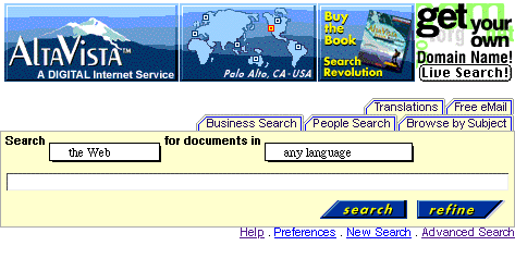 Advanced searches allow you to use so-called 'Boolean Operators' which are terms like 'And' (&), 'Or' (|), 'Not' (!) or 'Near' (~). For example to find pages that are about cod or halibut you would type 'cod | halibut'. AltaVista also allows you to search either the World Wide Web or Usenet, and for documents written in different languages. There are also a number of specialized features that you can read about by selecting the 'Help' buttons.