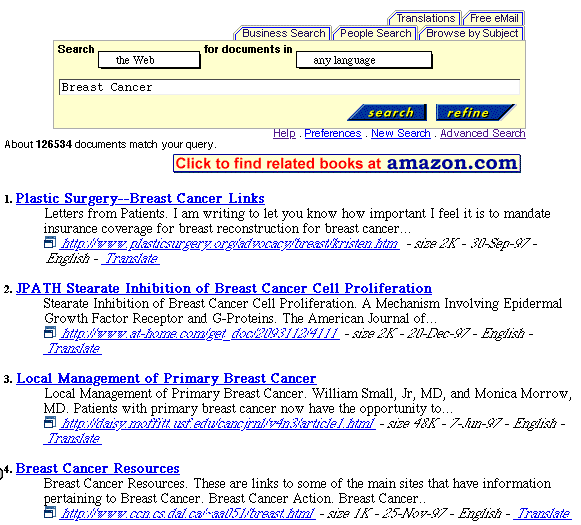 Below, for example, are part of the results of a search on the phrase 'breast cancer' on AltaVista. You'll note that there were 126,534 pages of information found!
