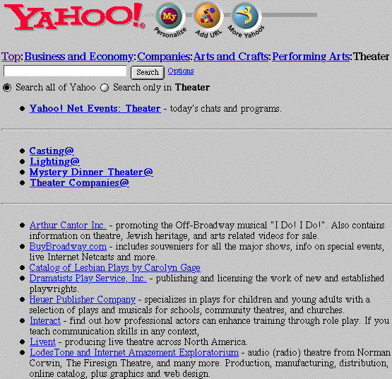 This page is called Business and Economy: Companies: Arts and Crafts: Performing Arts: Theatre, however, I could have come to this page by choosing Arts and Humanities first and following the appropriate cross- references from there. Notice that Yahoo also gives you the title of the page (complete with an active link to it) as well a two line extract from the beginning of the document.