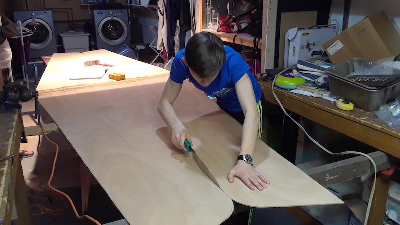 Gideon with Japanese saw cutting two more sheer lines from amidships to stem and plane same.