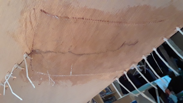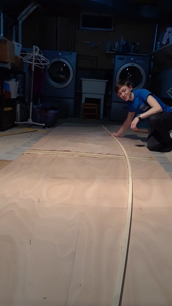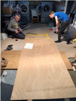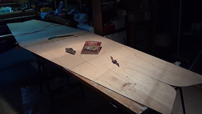 Laid out canoe hull on 4 ft x 16 ft 4 mm Okume Marine Plywood.