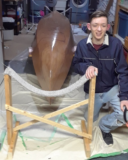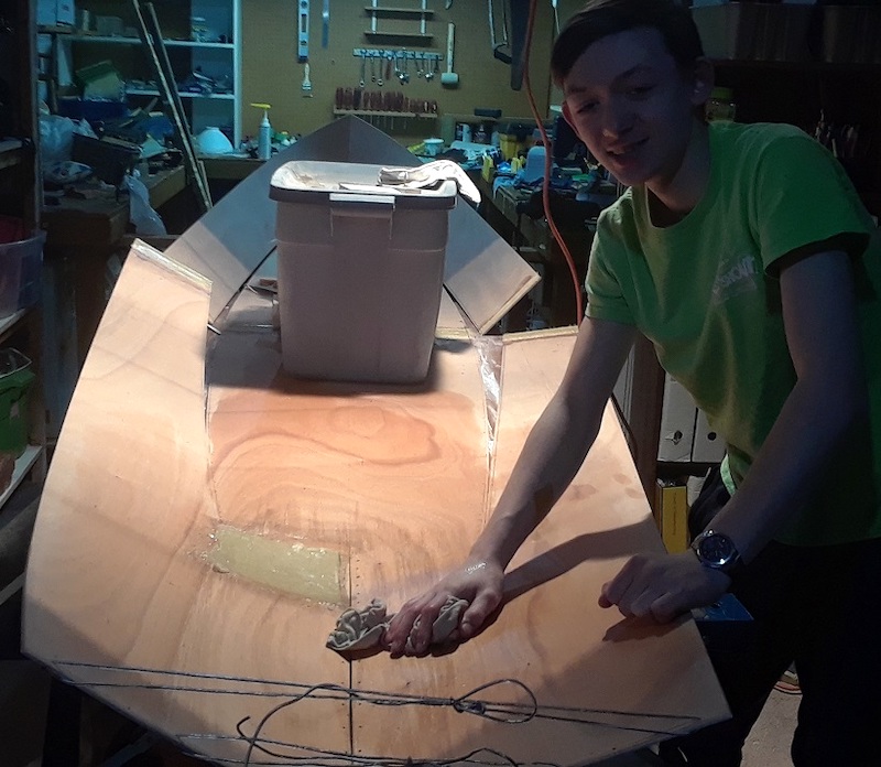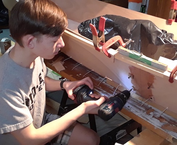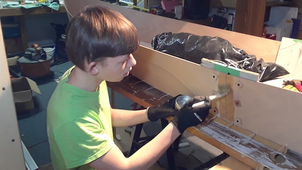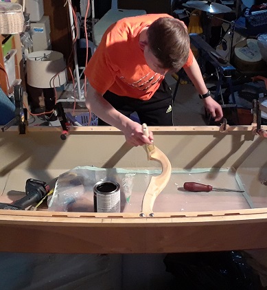 After supper, Gideon starts a couple of new tasks. Plugging over screw holes in gunwales, installing yoke and brushing Varathane on