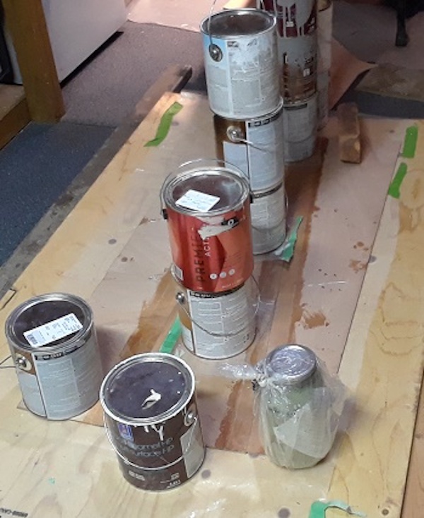 Step 34 - 39. Setting the Rocker and Bottom Arc. That's what the paint cans and tool boxes are for...weight. Didn't have any 50 lb sacks.