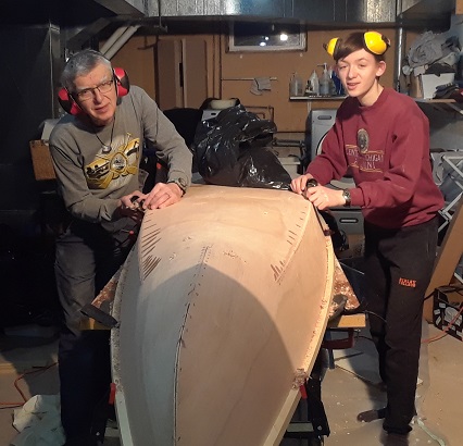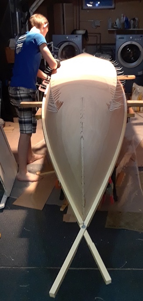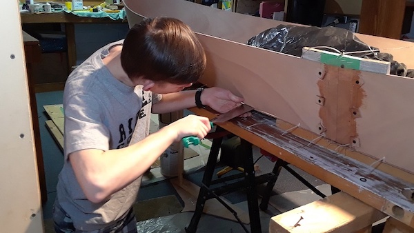 It's all hands on deck for shaping the external chines and stems, Steps 135 to 143, and 148 to 149 or as we say, fairing the hull. Yes... we've gone Rogue, now leaving out some and creating our own steps. One of which was the yoke.