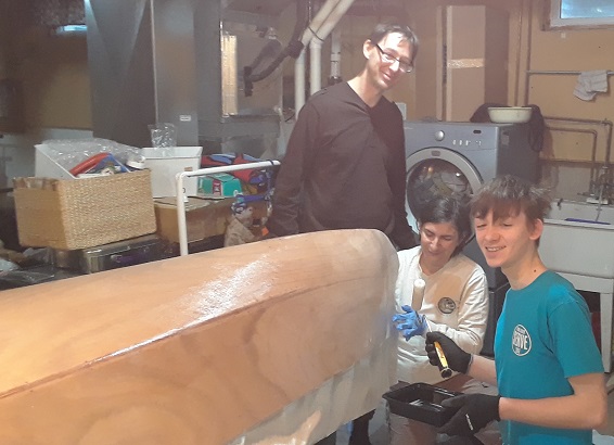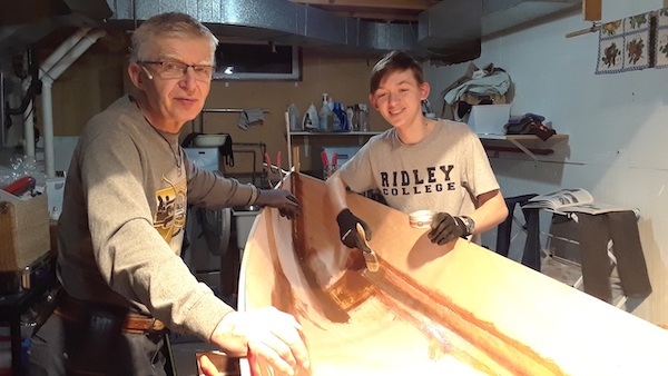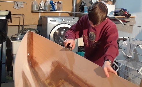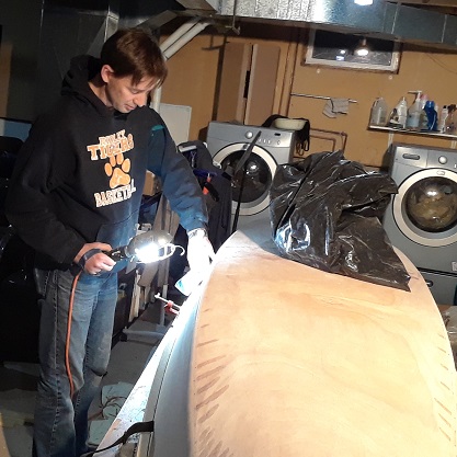 Gideon started to sand down the tops of gunwale and hull edge to match, bigger job than we thought. Epoxied edge of canoe...very hard.