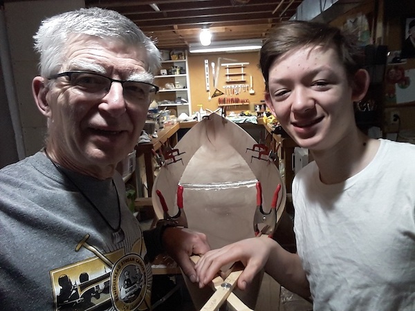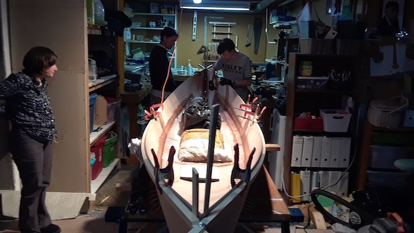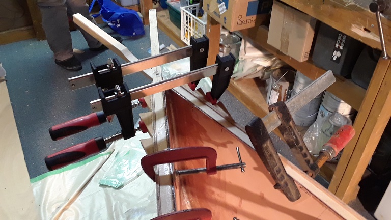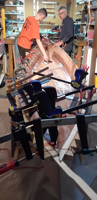 Gideon's back, impressed with my progress. We fit next gunwale then install, finish at 7:20 PM then supper. I know, looks like all the other clamp pictures but it's not. It's the last clamping picture!