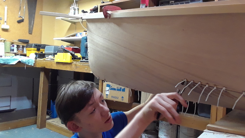 Now that the fillets are dry Gideon can finish Step 101, cut the ties off the outside chines and stems.