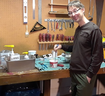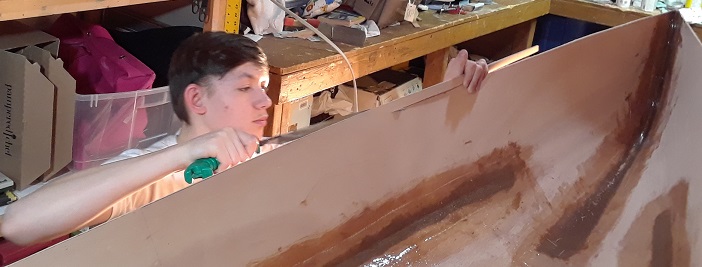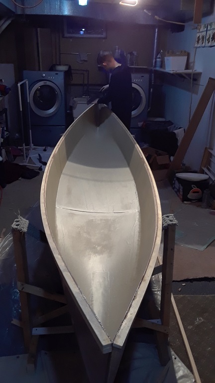 Gideons back and we ready to tackle filleting. You make up a thickened mixture of epoxy and wood powder and fill the chines, where sides and bottom meet.