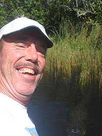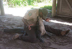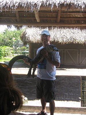 few alligators. The weather is sunny, hot and steamy. Once he cranks the