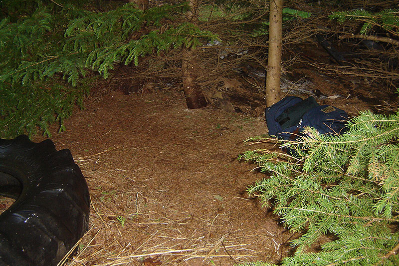I end up sleeping in the woods just off the road. Rain isn't too bad. My