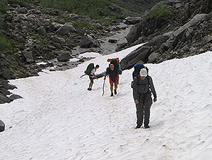 the snow. Crossing snow fields was a new treat particularly