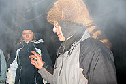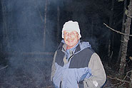 We cut inland to a fairly sheltered spot and lit what could best be described as a serious smudge, the word bonfire would have been a linguistic stretch. Thermos bottles came out and a few people held their food over the fire to give it that authentic deep south smoked taste and aroma. Although I think they use hickory in the south, we made do with cat spruce. Sungod set up his camera ( quite a few times) and finally got some photos of smoke, dark trees and bulky overdressed persons looking somewhat like Inuit refugees.