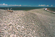 to circle around a long rock ridge, referred to as the spit that jots out into the bay a