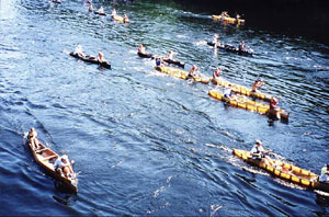 Friday saw marathon races for both youth (C1's) and adult (C2's) begin. Every five minutes, 30 to 50 canoes went off the line in waves. The organizers had the event so well structured-everything went like clockwork. Our race was exciting-we finished middle of the pack with Jean & Doug taking Darrell Spencer (BC) and myself right down to the finish line by one second. Louise said we could have stayed home and done that!! Oh well, it was a rush going off the line with that many boats and caliber of paddler. The Canadian junior C1 paddlers held their own with Kris Archibald awarded 2nd out of 12 positions and Bev Lewis 3rd out of 7 paddlers. Alex Calvin demonstrated that he would have been a force to reckon with had he been able to register late. Unofficially there would have been 2 Canadians in the top 3 places rather than 1. A rule preventing late registrations kept Alex Calvin out of the official race.