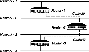 Figure 11-4 shows how costs are used to direct traffic over high-speed links. For example, if Router-2 in Figure 11-4 receives packets destined for Host B, it will route them through Router-1 across two T1 links (Cost=20) rather than across one 56kbps B-channel to Router-3 (Cost=240).