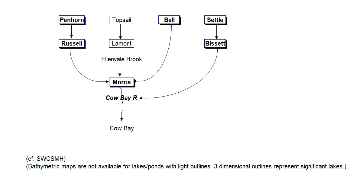 The bathymetric map; the morphological data; the watershed map; the location map; the flow chart of the Cow Bay River watershed; peruse our predictive modelling, and view a relevant model; the paleolimnology of lakes in HRM
