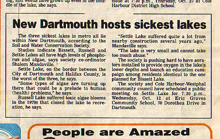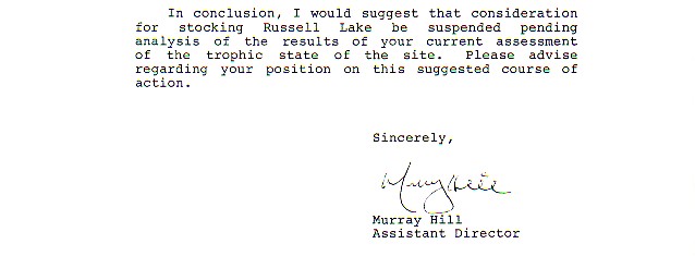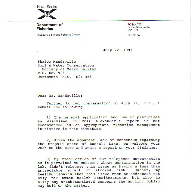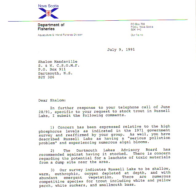 Nova Scotia Dept. of Fisheries expresses grave concerns in stocking Russell Lake with trout; July 09, 1991: