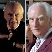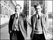 Dr. Francis Crick, left, and Dr. James D. Watson at Cambridge in the 1950's, after they discovered the double helix. The two have continued to drive the genetic revolution.