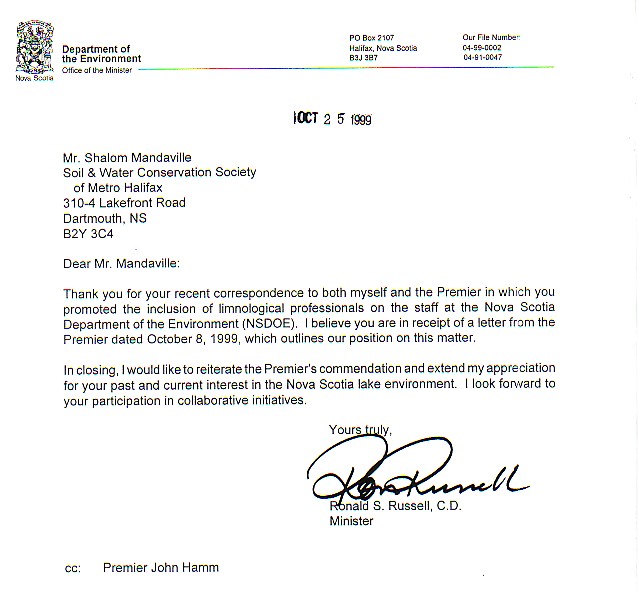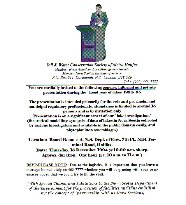 .............. with salutations to our primary founding partner in 1989, the Nova Scotia Environment Department; Formal inaugural invitation d/December 20, 1989 on the suggestion of their limnologist. Dr. John Underwood PhD ...............