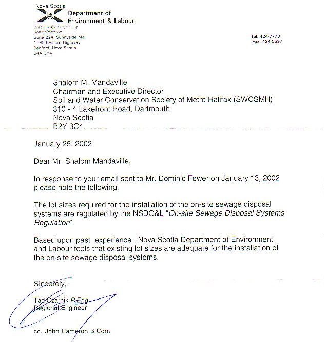 - Response of Tad Czarnik PEng, NSDEL w.r.t. lot sizes for onsite sewage disposal systems