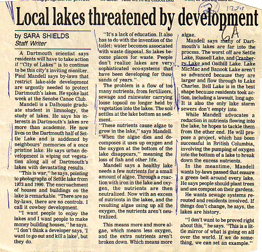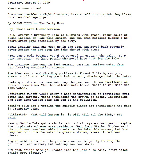 - Complaints by area residents: an article in the Halifax Daily News, August 07, 1999 on Cranberry and Settle Lakes
