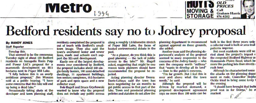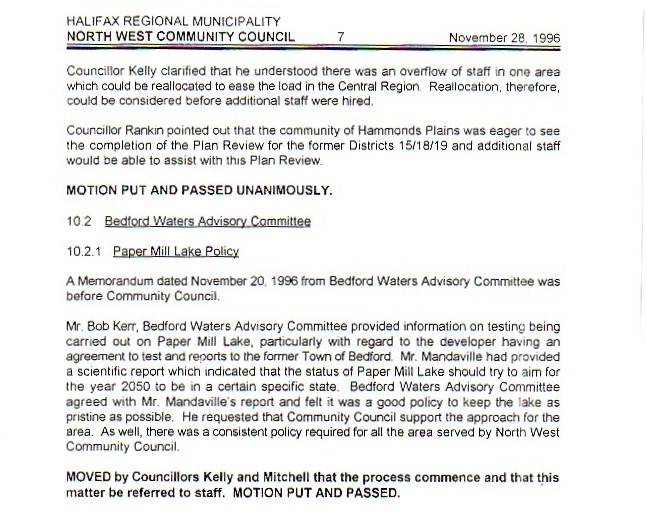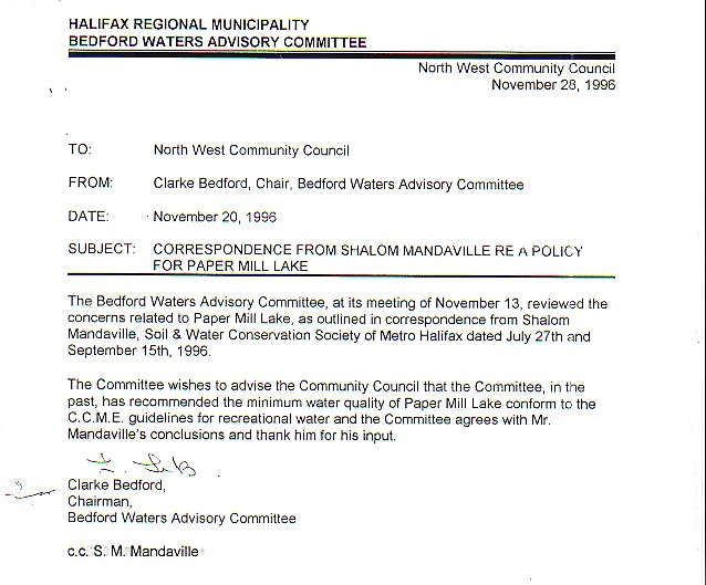 The Bedford Waters Advisory Committee (BWAC) did indeed support us, and pursuant to their support, the North West Community Council (NWCC) was also in favour of our recommendation. But nothing has transpired on a pragmatic level to date.