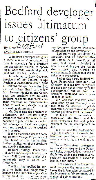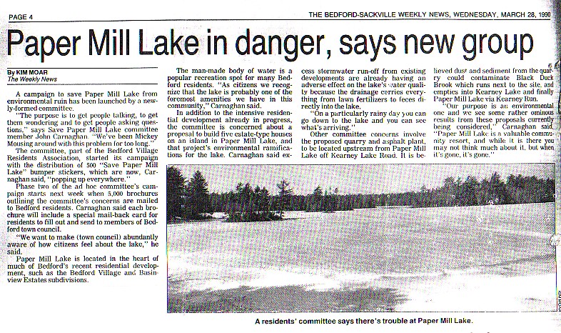 Pursuant to the concerns expressed by some local stakeholders at Papermill Lake over the whole last decade together with our own scientific concerns, we had written the Bedford Waters Advisory Committee (BWAC) twice during the 1990s requesting that they set a ethical `lake carrying capacity' as an yearly average TP (total phosphorus), yearly average chlorophyll-a and yearly peak chlorophyll-a values. Usually setting all three as the maximum allowable values would be the most preferable, but as a compromise, TP is sufficient. We also made approximately four (4) presentations to the BWAC as well as to the Town of Bedford's full Council during the 1990s.