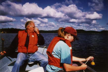 - Monica in the boat with volunteer, Pat MacCaull at the boat launching site, Russell lake, Oct. 22, 1998.