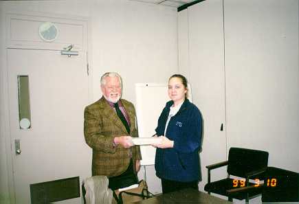 - Monica receiving an appreciation gift from a representative of our group, CWO Robert MacDonald. Bob is a veteran of WWII having served on the famous corvettes, the pride of Canada!