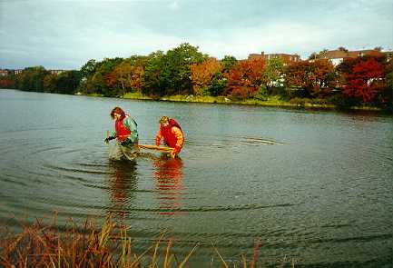 - Kim Hynes and Cathy Reeves collecting benthic macroinvertebrates at McGrath Lake using a kick-and-sweep method and a poled seine net.