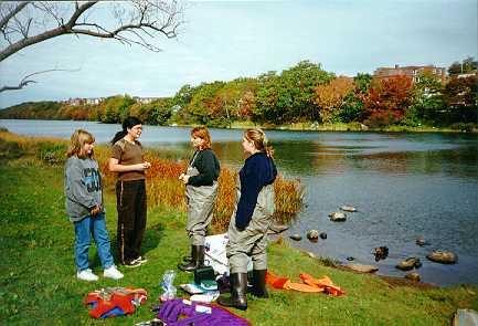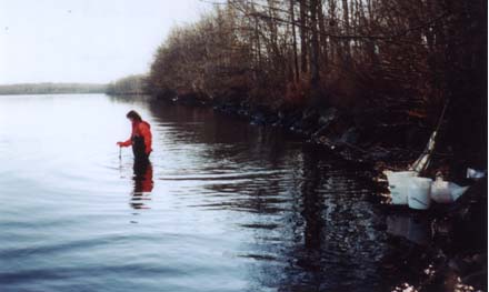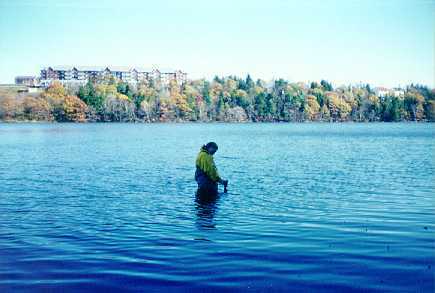- Monica in "deep water" (in more ways than one!) taking in-situ readings with a Corning Checkmate Multimeter at Site 5, Russell Lake, Dartmouth on Oct. 27, 1998.