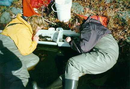 - Long-time volunteer, LCdr. Tom Willdey BSc along with the assistant picking through a sublittoral macroinvertebrate sample at Papermill Lake, Site 3, Nov. 04, 1998.