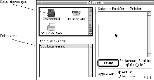 - The AppleTalk workstation user opens the Macintosh Chooser.
