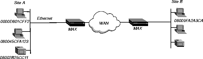 For example, Figure 8-2 shows the physical addresses of some nodes on the local Ethernet and at a remote site. The MAX at site A is configured as a bridge.