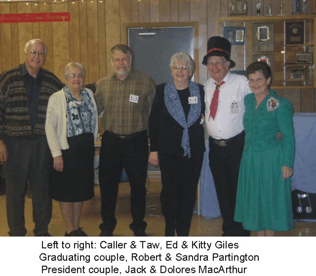 Caller Ed Giles got the festivities underway with his upbeat style and everyone on the dance floor. Cuer, Kitty Gileskept the momentum going when she ably led the dancers through the evening's round dances. Jack MacArthur, a localcaller, in his special style called alternate tips with Ed, much to the enjoyment of the dancers. A highlight came as Jackand his former calling buddy, Herb Muir, treated those present with a Christmas duet reminiscent of Christmasespassed.