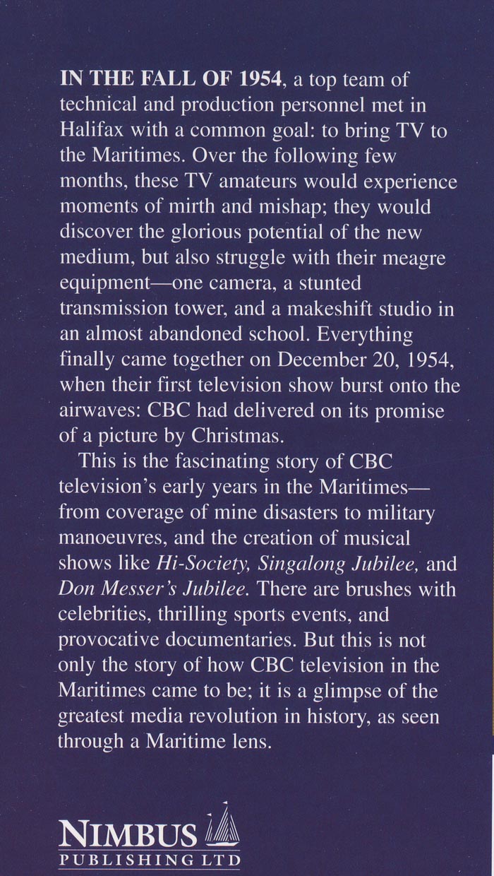 The idea originated with the CBC Pensioner's Association in Halifax. A committee was formed to gather information on the early years of TV with Bill Harper as chair. It soon became obvious that a committee was not the best way to proceed so Bill took over the project. As work progressed he found that he had more than enough material for a book. Nimbus agreed to publish it and the first copies arrived in Halifax in late October and volunteers from the Pensioners Association were at the station selling books when the CBC TV train was open to the public. Eighty-five copies were sold that day, and orders were coming in from other CBC people across the country. The association is not equipped to deal with shipping and handling so our president, Jack Brownell, offered to take on the project through his business, Frame Plus Art.