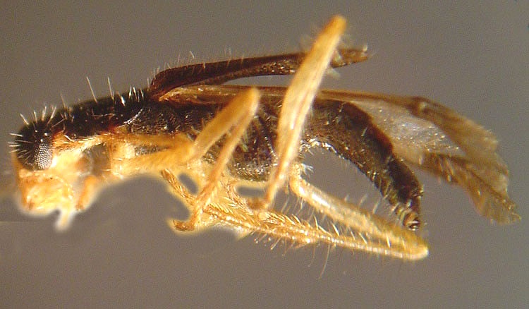 Isohydnocera curtipennis (Newman): 3.5-5.0 mm. Similar in appearance to P. pallipennis and P. verticalis in that the elytra in this genus is also short leaving a portion of the abdomen uncovered. They differ from Phyllobaenus in having a small basal tooth on the tarsal claws and in having antennomere 3 twice as long as wide. They are an dark bluish black in coloration with the legs, front of head, and a variably sized triangular area at the base of the elytra yellow. Opitz (2002) reports this species from the galls of Euura salicis-nodus Walsh (Hymenoptera: Tentredinidae) on willows (Salix spp.) and those of Gnorimoschema gallaesolidaginsis Riley (Lepidoptera: Gelechiidae) on goldenrod (Solidago spp.). In Atlantic Canada they are recorded from New Brunswick and Nova Scotia.