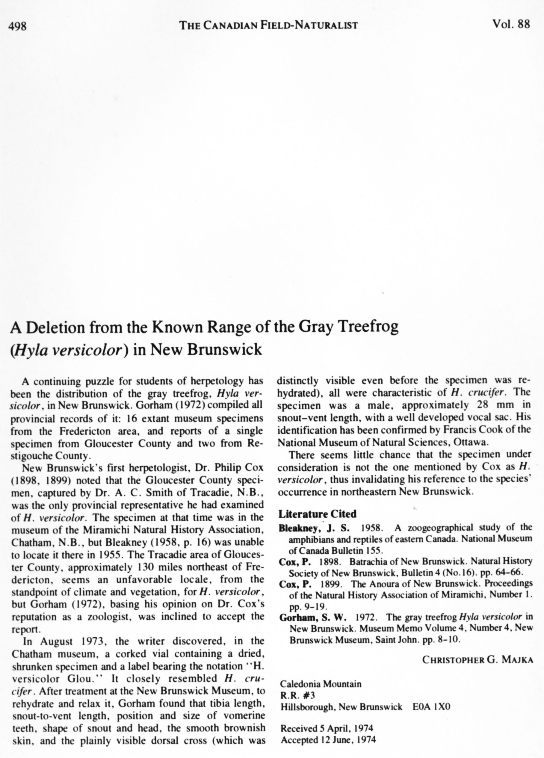 - A Deletion from the range of the Gray Treefrog in New Brunswick. Canadian Field Naturalist 88: 498.