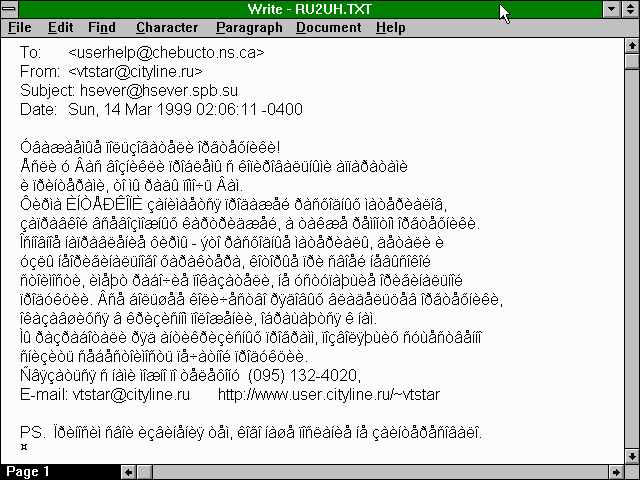 A message to userhelp arrived in my mailbox last March that I couldn't read. It was in Russian. I had no way of telling whether this was a query to userhelp about CCN or just another piece of junk email (a.k.a. 'spam').