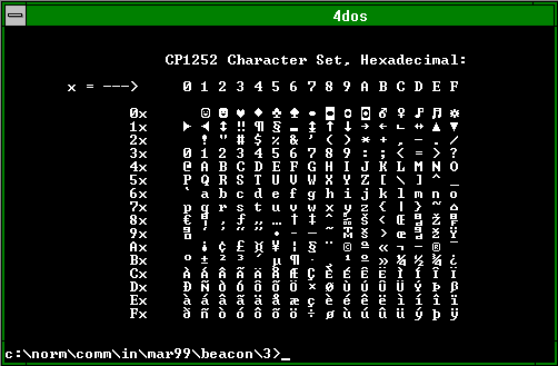 Here is a picture of 4DOS running in a DOS box after running a batch file to display all 256 characters: