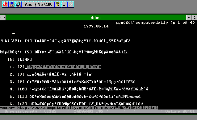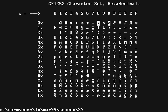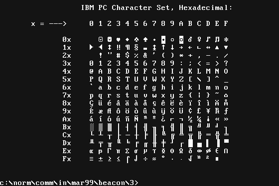 I have also created a rot-13 ( see footnote 1, Full Sail Vol.2 No.1) version of the VGA font so those using pine or lynx to read newspostings can shell out from TELIX (or whatever else they use) to DOS, load the "ROT13.FNT" font, exit from DOS back to TELIX (o.w.e.t.u.), and read rot-13 newspostings without having to manually decode them. Then shell out to DOS again and reload the ISO font to get back to normal. Download ROT13.FNT as a ZIP file and try it out with: