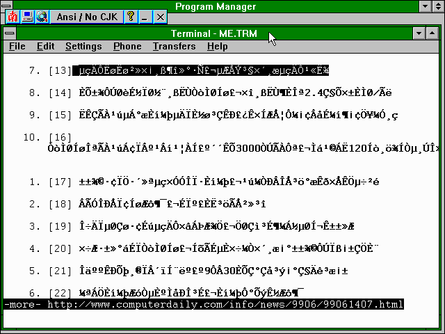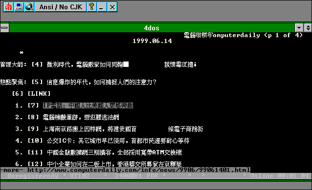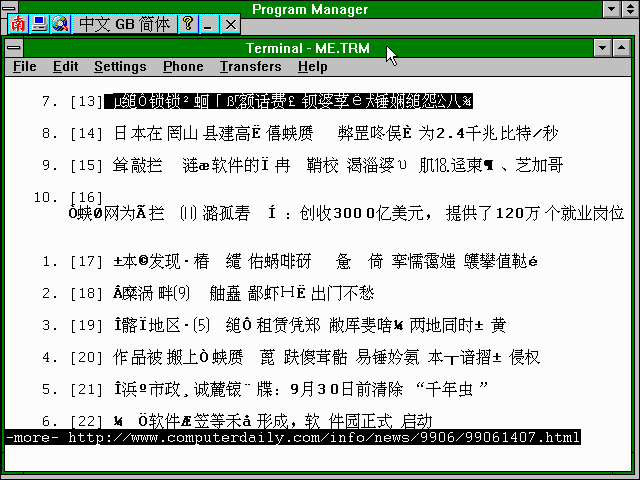 After much searching for something to use to view and print the Chinese messages in order to take them to Dalhousie University for translation, I saw, in a posting to the news.admin.net-abuse.email newsgroup, the URL for a viewer that can be used in Windows to display the text of such messages in Chinese. The NJStar Asian Software Development (南極星軟件公司) site in Australia has available for download as shareware their NJWIN CJK Viewer for Windows 3.1/95/98/NT. While most of their other CJK (Chinese, Japanese, and Korean) software requires Windows 95/98/NT/2000, their viewer will also work with Windows 3.1. It intercepts text written to the screen in Windows and substitutes the appropriate Chinese, Japanese, or Korean text. (At least, it is supposed to do so. I was unable to get it to recognise and redraw a Japanese web page I tried viewing. It seems to work for Chinese and I have not encountered any Korean sites to test.) Note that for this to work while you are viewing pages with lynx, you must have lynx configured to assume your system uses the ISO-8859-1 or the cp1252 character set or else lynx will attempt to convert the characters to the character set it thinks your computer is using and NJWIN will no longer be able to recognise the encoding for the Chinese characters.