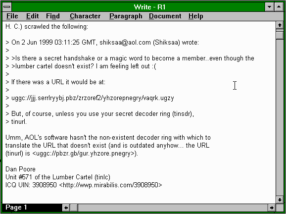 If you use Softy again, you can also create a ROT-13 font for Windows applications by swapping the 'A'-'M' with 'N'-'Z' and 'a'-'m' with 'n'-'z' in a cp1252 font. It can then be used to selectively decode parts of a usenet posting after you have downloaded it by highlighting the text to be decoded while viewing it with a Windows editor such as Write and change the font for the selected text only: