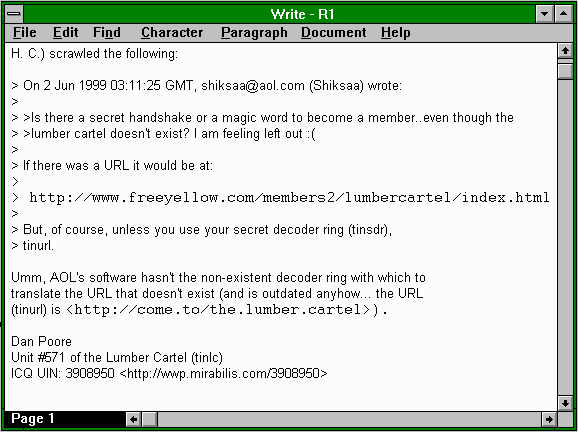 [Screen shot: A usenet posting being viewed with Write.]